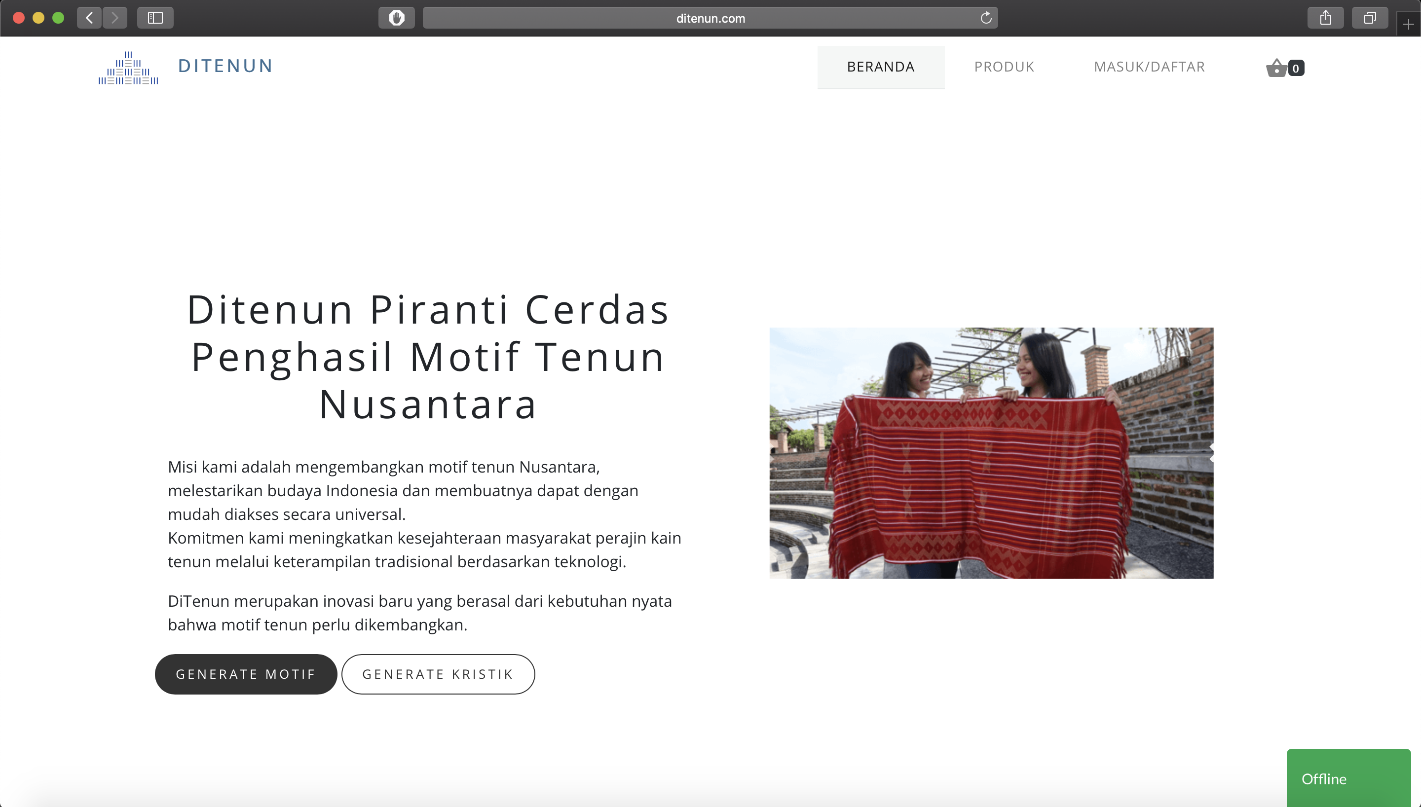 Misi kami adalah mengembangkan motif tenun Nusantara, melestarikan budaya Indonesia dan membuatnya dapat dengan mudah diakses secara universal. Komitmen kami meningkatkan kesejahteraan masyarakat perajin kain tenun melalui keterampilan tradisional berdasarkan teknologi.